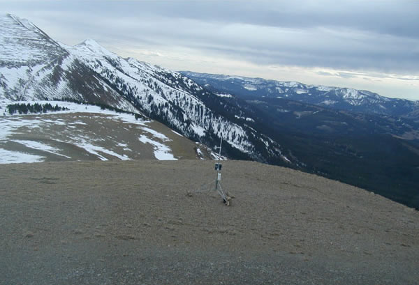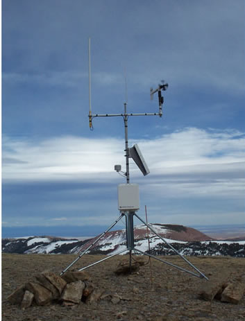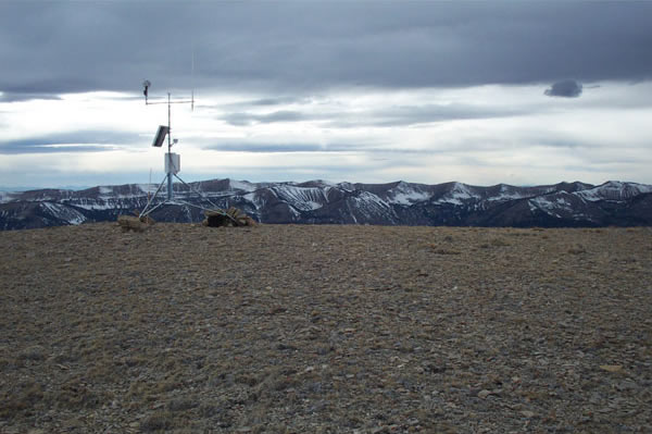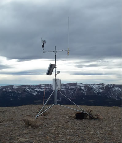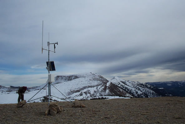 The Mount Coffin Wind Station is located on the summit of Peak 10,850 which is 7,800 feet north of the summit of Mount Coffin in the Wyoming Range. This station records temperature, humidity, wind direction, and wind speed. The buildup of rime ice on the wind sensor may cause this station to report lower wind speeds than are actually occurring.